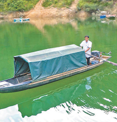 “一整天只够看几个患者,心里头哪能不急嘛!”龙光庆停下摩托车,沿着山路走了约20分钟,龙光庆走到排调河渡口。他挽起衣袖,拉动绳索,把一条渡船拉到岸边来。乌篷船荡开碧水,泛起层层涟漪。记者跟随跨上渡船,龙光庆调转船头向对岸驶去。