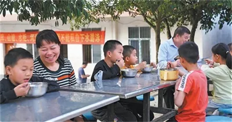“饭够不够?肉片要不要再来点?”黄秀碧用大勺给孩子们盛得满满的。夫妻俩为13个孩子都申请了农村义务教育学生营养改善计划补助资金,食材由配送公司每周送到学校,再分装冷藏保存。“你看,有青菜、木耳、肉片和鸡蛋,我们加工一下,基本的营养都能保障。”黄永勇说。