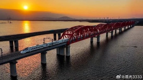 微博网友“晨光3333”分享夕阳下高铁与官厅水库相遇的美景。